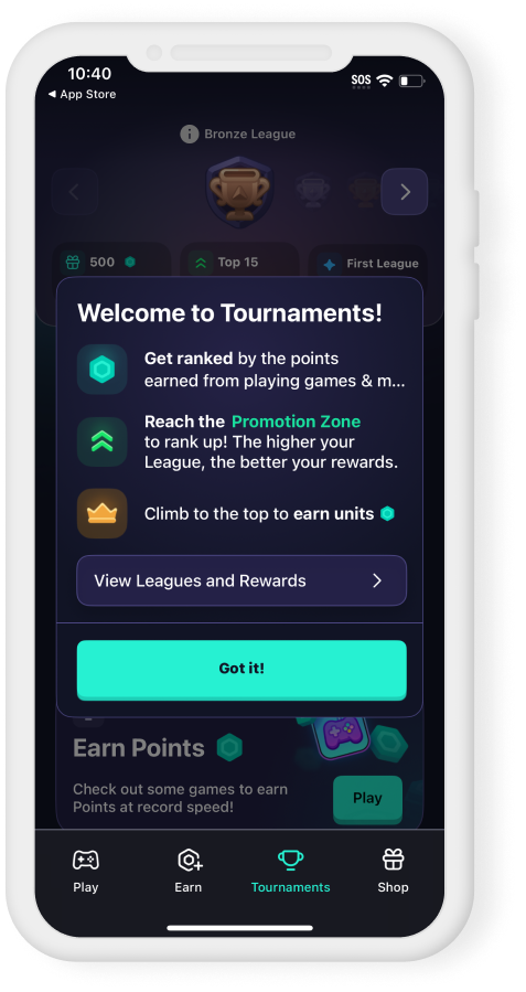 Play supported games and activities while the tournament is live, check your leaderboard frequently to see how close you are to the promotion zone, and use the play button on the Tournaments tab to get started quickly.