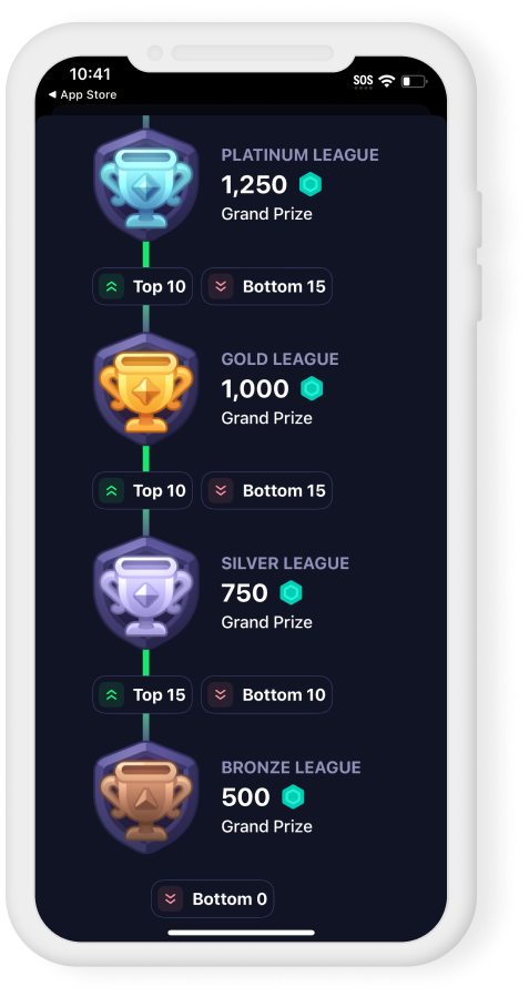 There are 10 leagues, and each league runs multiple tournaments of 50 players each. During an active tournament, you compete on your league’s leaderboard; your final position determines if you’re promoted, demoted, or remain in the same league for the next week.